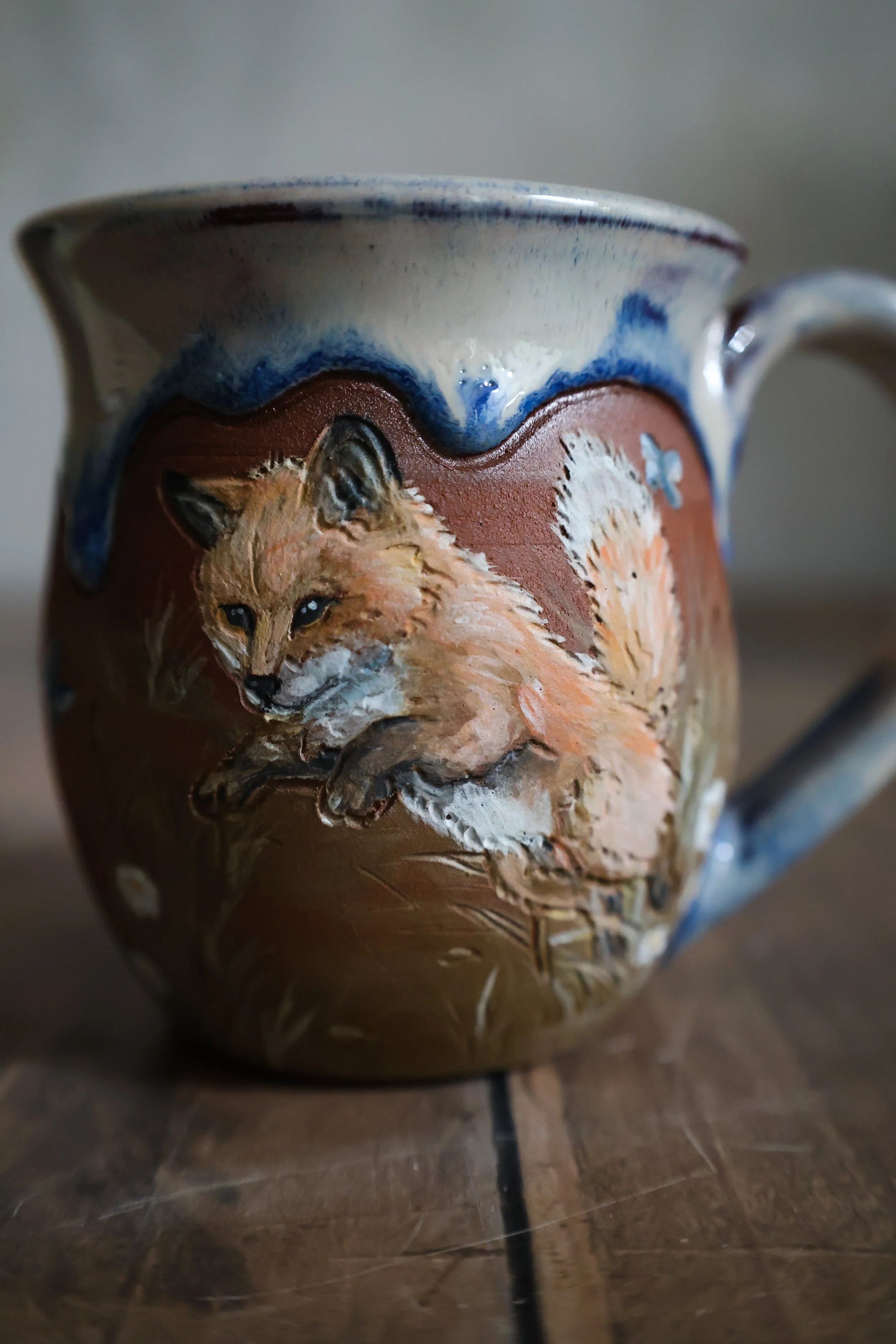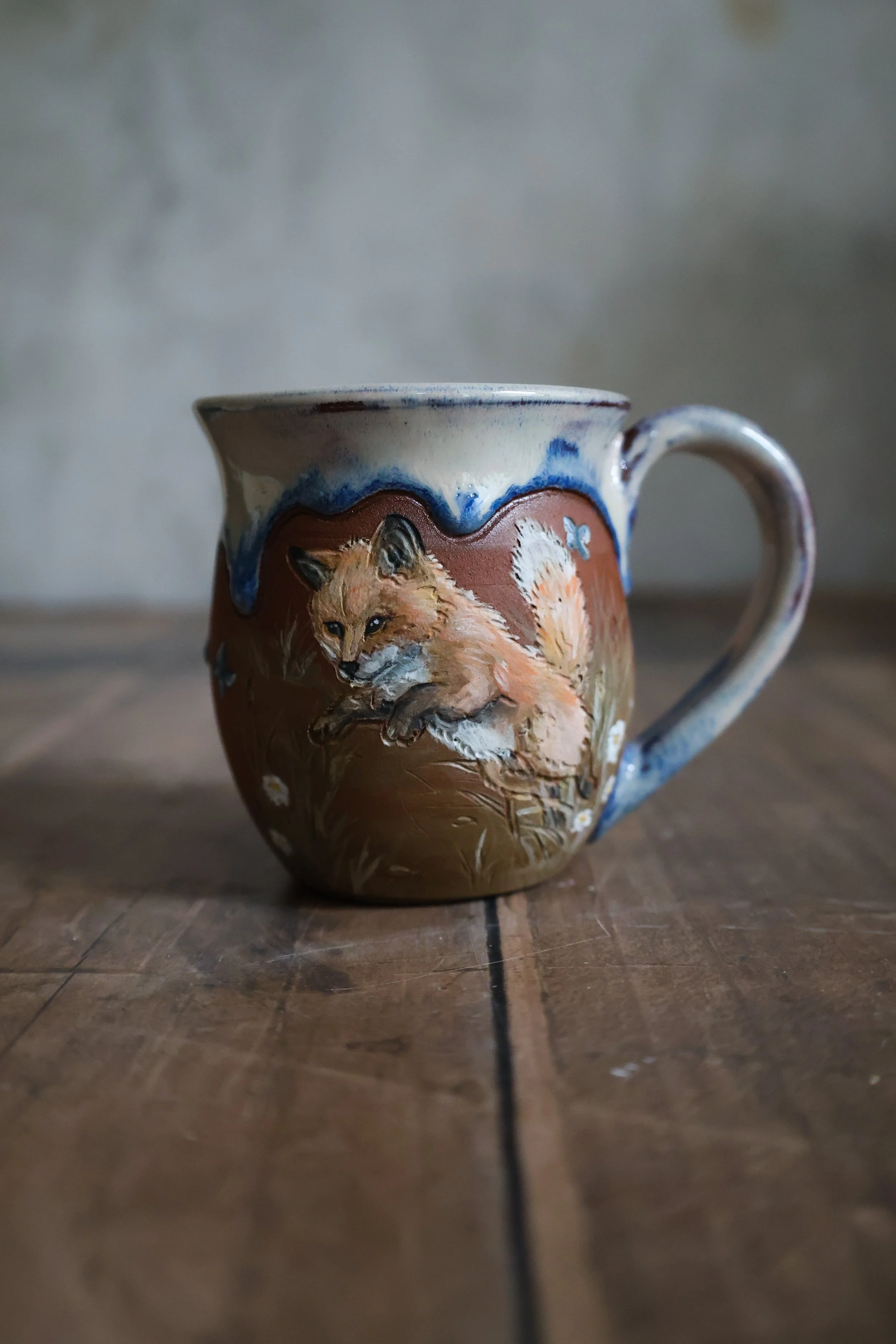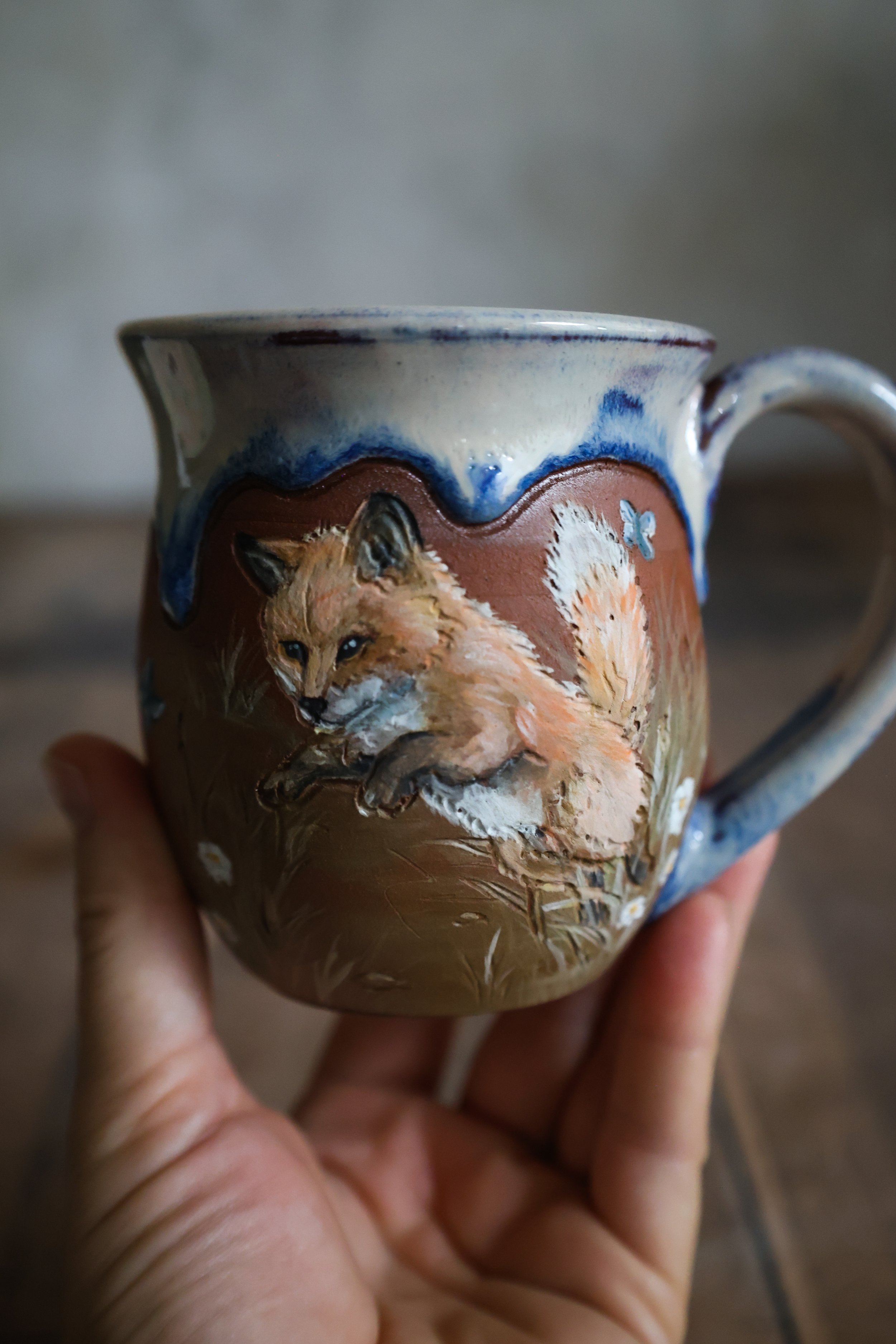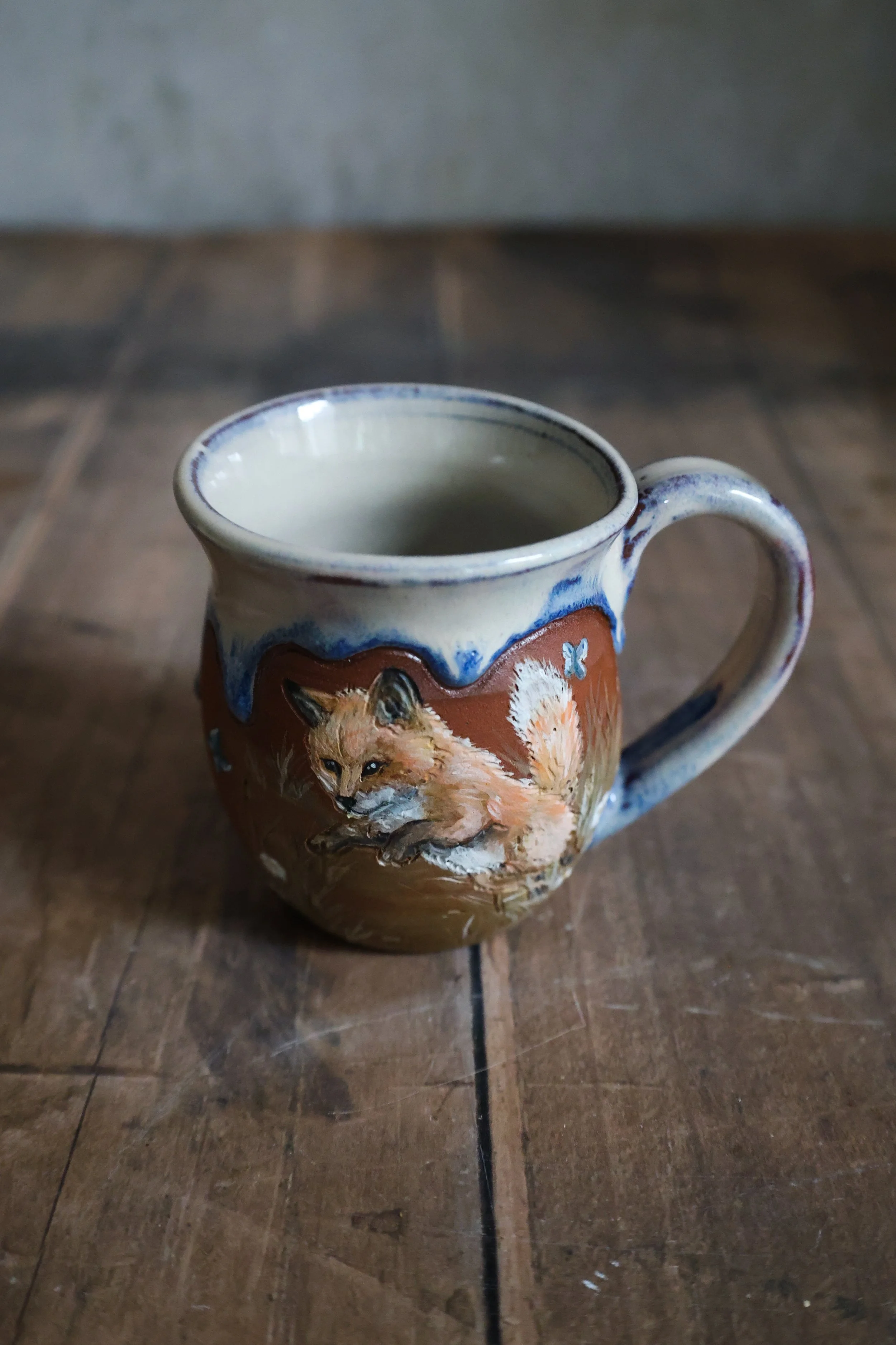 Hand Painted Ceramic Fox Cub and Butterflies Mug Small